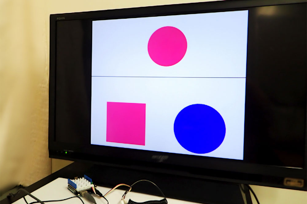 認知心理学系実験のイメージ画像.「赤い円」と似ているのは「赤い四角」と「青い円」のどちらだろうか?対象の似ている/似ていないを人間はどのように判断しているのだろうか?