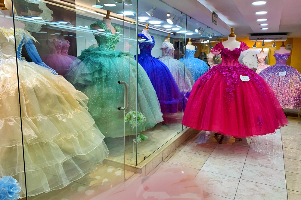 メキシコのショッピングモールに並ぶ「キンセアニェーラ」(女の子の15歳の誕生日)用の豪華なドレス。かつての結婚適齢期を祝う女の子の成人式のような伝統のなごり。